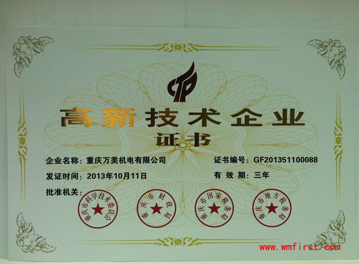 暨上次2010年再次獲得重慶市高新技術(shù)企業(yè)證書,此次復(fù)審?fù)ㄟ^,是我公司持續(xù)研發(fā)和創(chuàng)新的必然!同時(shí)這一榮譽(yù)是我公司上下全體同事齊心、努力、奮進(jìn)和相關(guān)領(lǐng)導(dǎo)大力支持的結(jié)果!我們將沿著這條道路持續(xù)下去,在未來,請相信萬美,會給您帶去越來越好的產(chǎn)品!